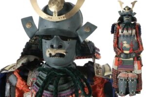 Cette splendide armure grandeur nature (portable pour un individu de taille raisonnable) comprend une boîte d’armure laquée et un cadre d’affichage en bois Oda Nobunaga (1534 – 1582), qui a joué un rôle clé dans le cours de l’histoire du Japon féodal. Sa politique d’unification d’un pays contrôlé par de nombreux chefs de guerre en conflit s’est poursuivie par une série de victoires caractérisées par des tactiques brillantes et la première utilisation organisée des armes à feu.