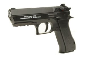 BABY DESERT EAGLE Co2 Culasse fixe en matériaux composite Modèle Métal et plastique avec Hop Up, Vitesse : 443 fps / 129 ms avec billes 0.12 gr 345 fps / 100 ms avec billes 0.20 gr Puissance :1,2 Joule Portée : 40 m environ selon type de billes Capacité : 15 bbs Poids : 647 gr Longueur : 20,5 cm Rail tactique picatinny pour accessoires (lampe, laser par exemple) Tir environ 150 coups avec une capsule co2