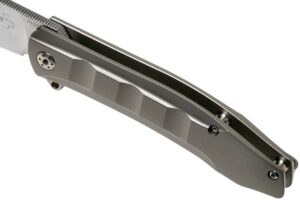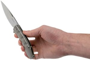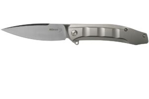 Doté d’une lame de 8,9cm ce couteau de poche boker est particulièrement surprenant du fait d’un esthétisme irréprochable. Son poids est de 120 grammes tandis que sa lame mesure 8,9cm et que sa longueur totale est de 10,8cm. La lame est en acier D2 et son manche en acier inoxydable, idéal pour une utilisation extérieure. On ouvre la lame rapidement avec le flipper. Les roulements à billes rendent l’action très fluide.