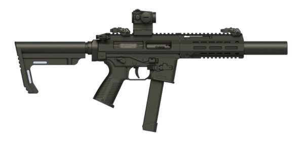 Caractéristiques principales :- Fonctionnement semi-automatique à culasse non-calée.- Calibre : 9×19- Canon de 115mm (environ 4,5″) martelé à froid et équipé d’un modérateur de son intégré (l’arme NE DOIT PAS être utilisée sans son modérateur de son).- Le canon comporte des perforations après la chambre pour capter une partie des gaz en expansion et les diriger dans la pré-chambre du modérateur de son pour diminuer encore plus le niveau sonore. Cette fonction permet aussi de faire basculer en subsonique la plupart des munitions à balles de 124 grains ordinaires ce qui évite d’avoir recours à des munitions subsoniques à balles lourdes de 147 ou 158 grains (celle-ci restent néanmoins utilisables).- Canon avec traitement QPQ (double nitruration conférant une résistance à la corrosion et à l’usure exceptionnelles)- Levier d’armement latéral réversible qui se replie vers l’avant automatiquement et n’accompagne pas la culasse lors de son cycle.- Un 2ème levier d’armement ambidextre au standard de l’AR-15 pour encore plus de souplesse à la fois dans l’ergonomie et dans les choix ultérieurs possibles.- Poussoir de chargeur et arrêtoir de culasse ambidextres (les 2 s’actionnent avec l’index).- Sûreté ambidextre rallongée.- Boîte de culasse usinée en alliage aéronautique anodisé.- Garde-main flottant avec rails Picatinny à 12h et à 6h, et système M-LOK à 3h et à 9h.- Poignée-pistolet démontable B&T (l’arme est compatible avec une poignée-pistolet pour AR-15).- Détente match à bossette.- Système de détente de l’AR15 (la détente à bossette d’origine est déjà excellente, mais il est possible d’adapter une détente encore plus performante. Nous consulter car toutes les détentes match pour AR-15 ne sont pas forcément compatibles, néanmoins Geissele fait déjà une variante d’une de ses détentes, optimisée pour l’APC9 et le SPC9, par exemple).- Amortisseur de culasse hydraulique issu de l’aéronautique : il permet de réduire le relèvement de façon spectaculaire.- Oeilleton et guidon repliables.- Crosse télescopique à 6 positions (marque MFT : Mission First Tactical).- Poids 2,950 kg avec le viseur Aimpoint.- Longueur : 692mm crosse rétractée; 775mm crosse déployée.- Fabriquée en Suisse.- Arme classée en catégorie B2.