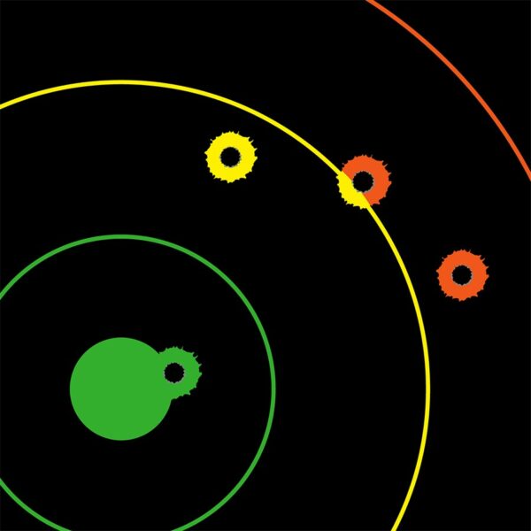 Résultats immédiats, pas besoin de se déplacer ou d’utiliser des jumelles, les impacts apparaissent en couleurs pour être visible de loin!Cibles en papier cartonné, à fixer sur un support de tir.Parfaite pour tous les calibres, de l’air comprimé au 44 magnum !Livrée avec des pastilles noires pour masquer les impacts…et redevenir jaune si vous touchez au même endroit !Chaque zone de la cible réagit avec une couleur spécifique.