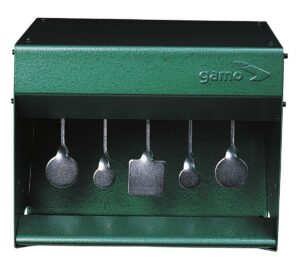 Cible pour calibre 4,5 mm, cibles pendulaires, effacement des 4 cibles métalliques à l’impact, retour avec impact sur la cible métallique carrée au centre.