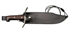 La lame est en acier au carbone 1090. Il s’agit d’une lame longue et large avec un équilibre de poids vers l’avant et est au sol sabre et fortifiée avec un faux bord pour assurer une puissance de coupe et de perçage. La poignée a un profil classique, avec des écailles de palissandre attachées à la lame pleine soie avec des vis en laiton, son garde-main en laiton à motif «S» caractéristique pour protéger vos doigts et améliorer son potentiel défensif. Le Wild West Bowie est équipé d’une gaine en cuir noir traditionnel qui comprend une boucle de ceinture en laiton et une sangle de jambe en cuir.