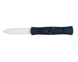 Couteau automatique éjectable « 007 » Lame: En acier inox avec systeme de blocage Manche: Longueur de 10,5cm noir en matière synthétique Ouverture/Fermeture: Système d’ouverture/fermeture automatique par pression d’un bouton sur le manche avec sécurité: la lame s’ouvre et se ferme dans le prolongement du manche