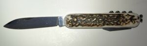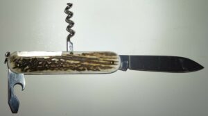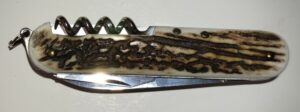 lame 75 mm, décapsuleur, ouvre-boîtes et tire-bouchon, plaquettes bois de cervidé.