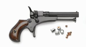 Poids : 155 g.Contexte historique : Dans la seconde moitié du XIXe siècle, les petits pistolets connus sous le terme générique de ‘derringer’ étaient courants. Certains existaient en calibre 4,5 mm. (. 177) pour la pratique du tir en intérieur. Ces armes en acier utilisent une amorce de type 209 placée dans un système clos pour supprimer tout risque de projections.