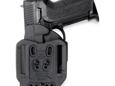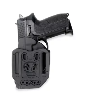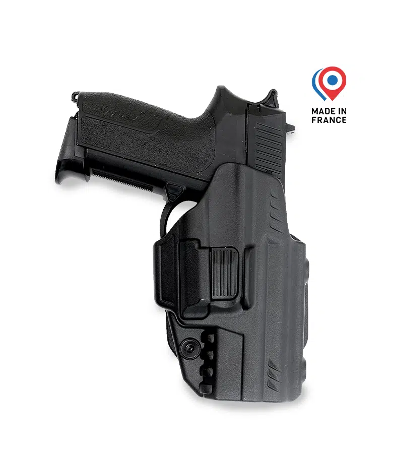 Son système de rétention intégré maintient votre arme fermement en place tout en garantissant un dégainage fluide et naturel. Il suffit d’un simple appui du doigt sur le bouton poussoir, idéalement positionné pour une réactivité maximale.