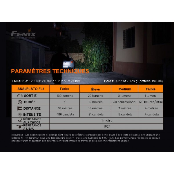 Puissance maximale de 100 lumens, distance de faisceau maximale de 40 mètres.