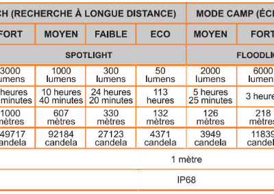 - Les modes Spotlight et Floodlight permettent de répondre à différentes demandes d’éclairage. Le mode Spotlight peut être utilisé pour la recherche à longue distance, tandis que le mode Floodlight est idéal pour l’éclairage de grandes surfaces.