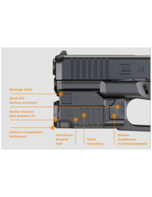 GLOCK présente la nouvelle Lampe LED GTL II spécialement conçue pour les pistolets GLOCK avec rail de montage. *(Ne convient pas aux modèles GLOCK Slimline.)