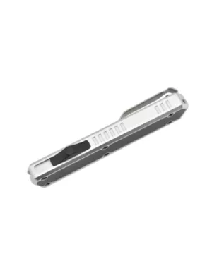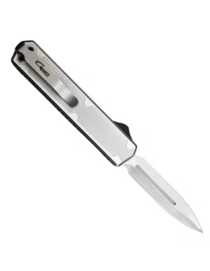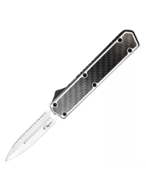 Couteau automatique OTF Golgoth, lame en acier D2 double tranchant avec serrations sur le haut.