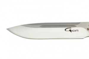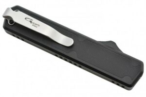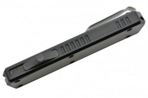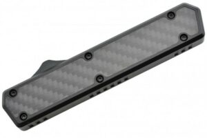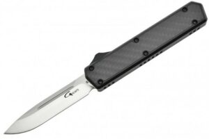 Couteau automatique OTF double action Golgoth comprenant une lame en acier D2, et un manche en aluminium avec insert en fibre de carbone d’un côté. Le couteau est équipé d’un clip de poche en acier avec inscrit le numéro de série.