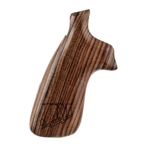 Le design lisse et étroit du « révolver le plus rapide au monde » offre aux tireurs de compétition et de vitesse un tir rapide et un contrôle maximal du recul. La construction en une seule pièce présente un dos ouvert pour une prise en main confortable et un excellent accès à la détente ; elle s’ajuste parfaitement au cadre. Sa taille minimale aide à prévenir le « printing ». Non striée, ce qui permet aux vêtements de glisser facilement dessus. Fabriqué en attrayant Pau Ferro. Initiales JM gravées sur les poignées.