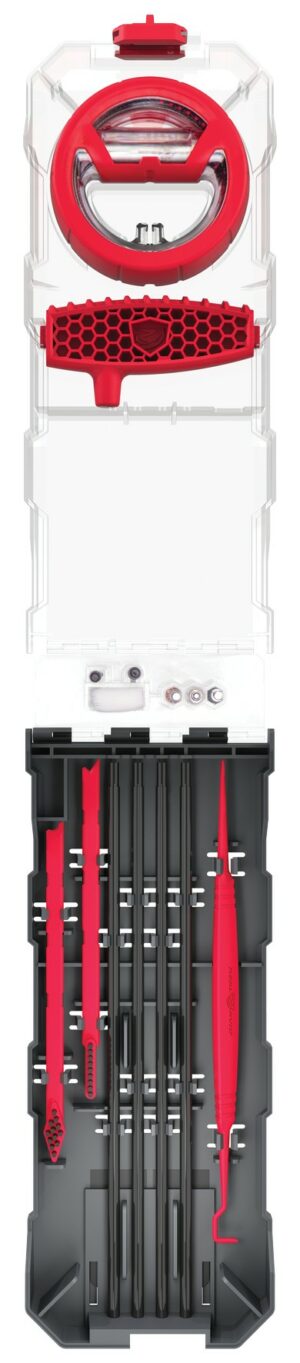 Le gun boss multi kit est complet pour entretenir du canon à la chambre et l’intégralité du mécanisme.Il s’utilise aussi bien sur le terrain qu’à la maison pour une maintenance parfaite de votre arme avec son boitier ultra résistant en polycarbonate qui sert de support dès son ouverture.Il contient :- le célèbre BORE BOSS avec son écouvillon adapté au calibre- 1 poignée ergonomique- 1 tige acier (en 4 parties)- 3 écouvillons différents (laine, nylon et bronze)- 2 embouts nylon (pour les patchs)- 1 tige ACCU GRIP (une extrémité avec crochet et l’autre droite)- 2 brosses de formes différentes en nylon- 25 patchs