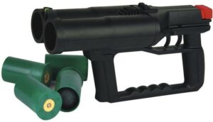 Pistolet 2 coups Finition: bronzé noir Calibre : 44/83 Balle de caoutchouc Longueur totale :37 cm Poids: 1100gr Efficace jusqu’à 12 mètres