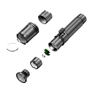 Lampe tactique rechargeable polyvalente avec embout brise-vitreDistance d’éclairage maximale : 230 mIntensité lumineuse maximale : 1300 lumensAutonomie minimale : 3,2 heuresAutonomie maximale : 50 heuresTrois intensités lumineuses (30, 200 et 1300 lm)Mode clignotant (1300 lm)Fabriquée en alliage d’aluminium de qualité aéronautiqueRésistance aux chutes : 1 m de hauteurÉtanchéité : norme IPX-6 (résistance aux projections des jets d’eau puissants)Livrée avec une batterie Lithium-Ion 18650 3.7V 2600 mAh, un cordon de rechargement USB vers USB type-C, une dragonne et un joint d’étanchéité de rechangeDimensions : diamètre de la tête 3,5 cm x diamètre du corps 2,7 cm x longueur de la lampe 16 cmPoids net : 135 g (sans batterie)Poids brut : 185 g (avec batterie)Couleur : noirGarantie : 1 an