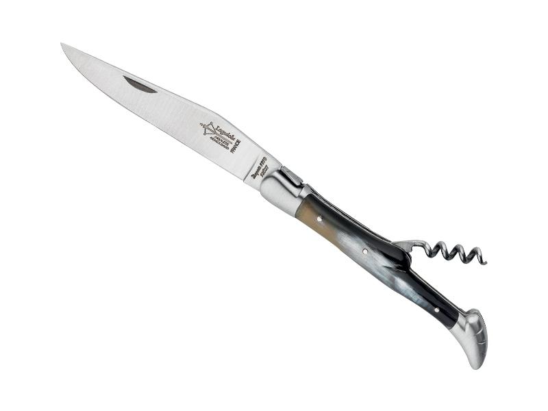 Couteau « Laguiole d’antan » G. DAVID, 2 pièces (lame acier 12C27, tire-bouchon), manche 12 cm corne, 2 mitres inox mat, ressort guilloché.