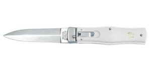 Lame 9,5 cm acier inox 420 Manche synthetique BLANCOuverture automatique par pression sur la languette située sur le mancheLongueur ouvert: 21,5 cmLongueur fermé: 12 cmPoids: 130g