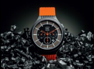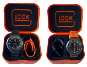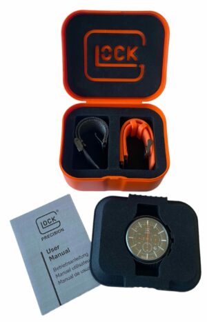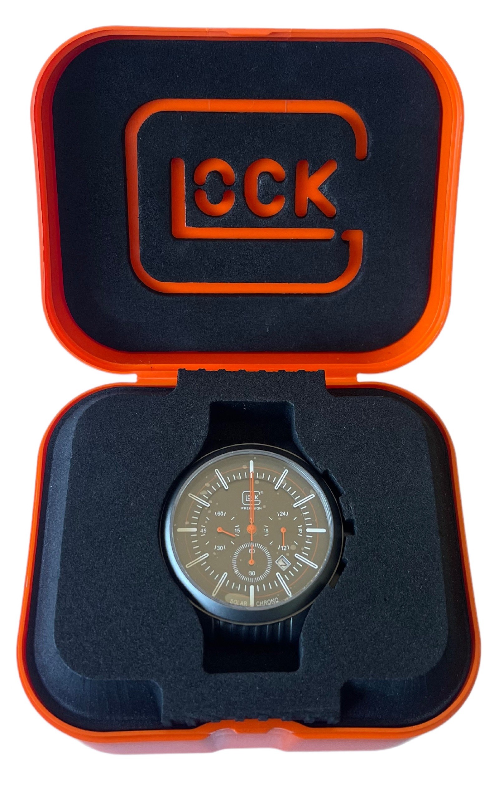 – Fonction chronographe.- Verre saphir (quasiment inrayable).- Alimentation solaire (pas besoin de changer une pile, la montre est rechargée par la lumière naturelle ou artificielle, avec une autonomie de 6 à 12 mois avec une seule charge).- Le poussoir central reprend la forme d’une amorce.- Le boitier comporte des stries reprenant le dessin des stries de préhension de la culasse d’un pistolet Glock.- Bracelet innovant, interchangeable facilement.- Résistance à l’immersion dans l’eau jusqu’à 10 ATM soit 10 bars ou 100 mètres de profondeur sous l’eau.- Livrée avec 2 bracelets : un noir et un orange (le bracelet orange est en silicone)- Livrée dans une boite orange Glock.