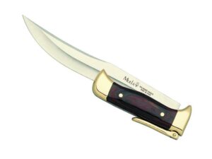 Poignard pliant MUELA, lame acier inox X50CrMoV15, manche plaquettes stamina (ouverture et fermeture commandées par le levier), étui cuir.