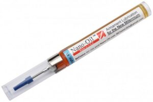 Elle contient des particules nanoscopique de 0,09 microns qui agissent comme un roulement à billes, et améliorent la durabilité du graissage, tout en préservant de la poussière. Le flacon, d’une contenance de 8ml, est surmonté d’une aiguille pour une application d’une grande précision. Nano-Oil est fabriquée par les laboratoires StClaire aux États-Unis.