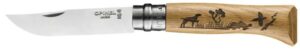 Fabriqué au coeur des Alpes depuis 1890, l’Opinel puise dans ses racines montagnardes sa robustesse et sa simplicité. Au travers de différents modèles Animalia, gravés en séquenses de 3 positions, découvrez la gestuelle majestueuse des animaux que vous aimez.Lame acier inoxydable Sandvik de forme dite Yatagan (incurvée au niveau de la pointe) de 8,5 cm (N° 8) et au profil bombé qui garantissent une qualité de coupe incomparable. L’acier inoxydable Sandvik mis au point pour Opinel est réputé pour son tranchant et sa facilité d’entretien. L’acier inoxydable capable de subir le traitement thermique qui lui donne sa bonne dureté est appelé martensitique. Il a une teneur en carbone au moins égale à 0,40 % ce qui permet d’obtenir un tranchant satisfaisant sans être sensible à la corrosion.Manche chêne vernis naturel. Système double sécurité Virobloc. Cette bague de sécurité en acier inoxydable permet de bloquer la lame en position ouverte pour une sécurité d’utilisation mais également en position fermée pour une sécurité de transport.