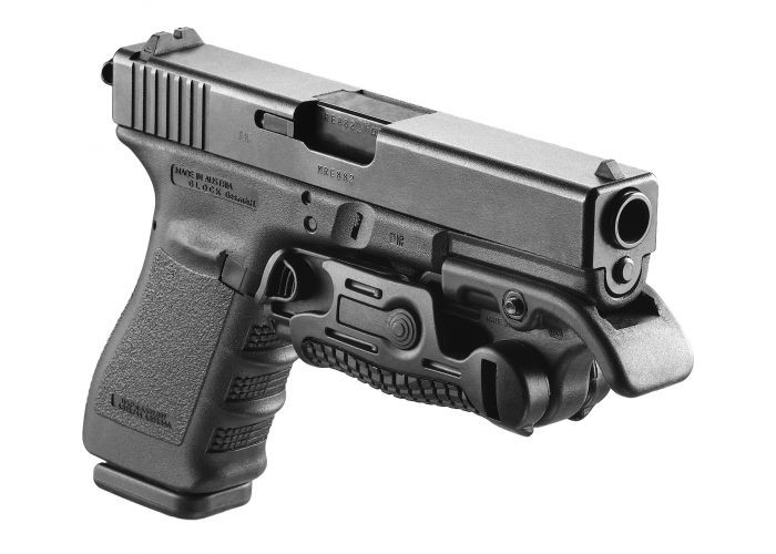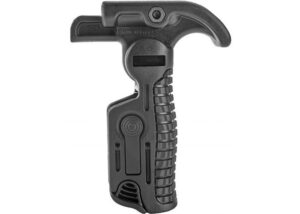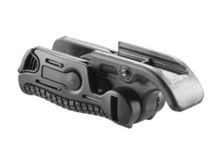 La poignée avant FGGK deux positions, passe d’une position horizontale à verticale par simple pression sur un bouton, elle fait également office de couvre pontet (sur arme de poing) en la faisant coulisser horizontalement.