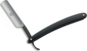 Rasoir lame acier carbone 5/8 évidé Manche synthétique noir La lame de 18 mm de largeur doit être essuyée après usage Convient pour tout type de barbe Poids: 38 grammes