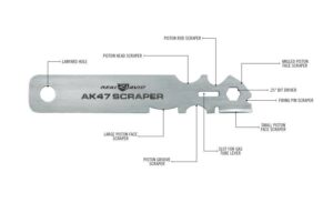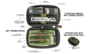 Kit de nettoyage Real Avid conçu spécifiquement pour les AK47 compranant : Une tige fileté à tête pivotante, outil racloir spécifique au décrassage de votre piston, témoin de chambre, écouvillon de chambre, brosse en nylon pour tube gaz et tampons de nettoyage.