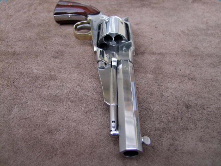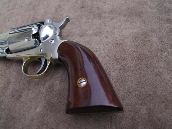 MODÈLE : 1858 Sheriff CALIBRE : 44 SYSTÈME : Percussion CROSSE : Noyer NOMBRE RAYURES : 8 PAS RAYURES : 1-16″ FINITION CANON : Inox LONGUEUR CANON : 140mm LONGUEUR TOTALE : 320mm