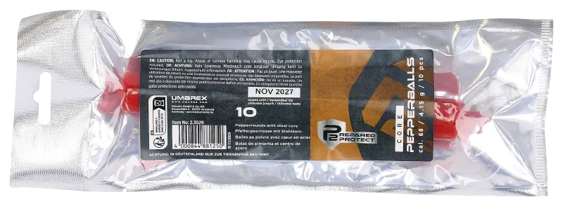 Ces billes de défense au poivre calibre .68 sont dotées d’un noyau en acier centré et d’une coque renforcée assurant une trajectoire stable et un éclatement fiable à l’impact. Leur conception garantit une dispersion efficace de l’agent irritant contenu à l’intérieur.