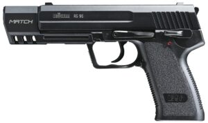 Pistolet à blanc et à gaz Cal. 9 mm PA, chargeur 9 coups, double action.Longueur 225 mm. Poids 920 g. Livré en mallette avec embout lance-fusée.