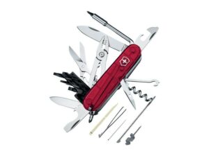Manche 91 mm, rouge translucide.34 FONCTIONS (19 PIECES).1. grande lame2. petite lame3. tire-bouchon4. ouvre-boîtes avec :5. – petit tournevis 3 mm6. décapsuleur avec :7. – tournevis 6 mm8. – dénude fil électrique9. poinçon alésoir avec :10. – chas d’aiguille11. épingle12. mini tournevis 1.5 mm13. pincettes14. clef porte-outils avec :15. – clef 6 pans 5mm (pour connecteurs D-SUB)16. – porte embout 4mm17. – embout Phillips 018. – embout Phillips 119. boîtier avec :20. – embout tournevis 4 mm21. – embout Phillips 2 mm22. – embout Hex 4mm23. – embout Torx 824. – embout Torx 1025. – embout Torx 1526. stylo bille pressurisé27. – pour déplacer DIP-Switch28. cure-dents29. anneau30. pince multi-usages avec :31. – coupe-fil32. – serre-cosse33. ciseaux34. crochet multi-usages