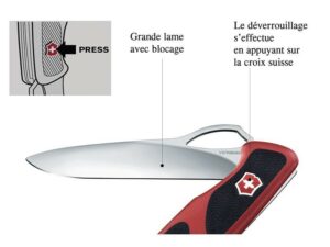 Manche bi-matière 130 mm12 FONCTIONS (7 PIECES)1. grande lame blocable ouverture une main2. ouvre-boites avec :3. – petit tournevis 3 mm4. décapsuleur avec :5. – tournevis blocable 6 mm6. – dénude fil électrique7. poinçon alésoir avec :8. – chas d’aiguille9. tire-bouchon10. pincettes11. cure-dents12. anneau