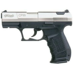 Pistolet à plombs Walther CP99 bicolore, fabriqué par la célèbre firme Umarex. Il fonctionne à l’aide de cartouches co2 12 grammes.